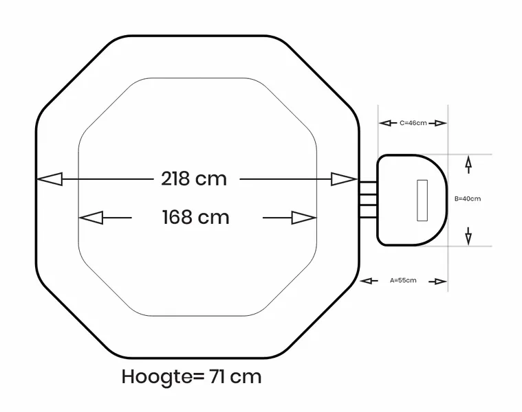 Let op: Om de Intex Pure Spa Jet & Bubble volledig (inclusief motorblok van 40x46x55 cm) te kunnen plaatsen, adviseren wij een minimale (tuin)ruimte van 300 bij 220 cm. De kabel is 3,5 meter lang, dus zorg dat er binnen deze lengte een stroomvoorziening aanwezig is.